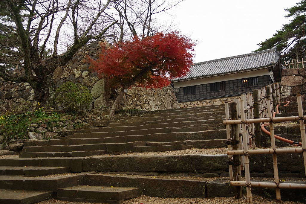 写真2は、外曲輪からの大手門跡です。左手へと本坂(階段)を上り二ノ丸・本丸へと入ります。