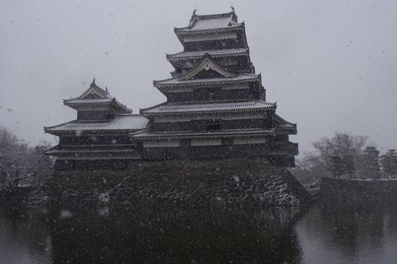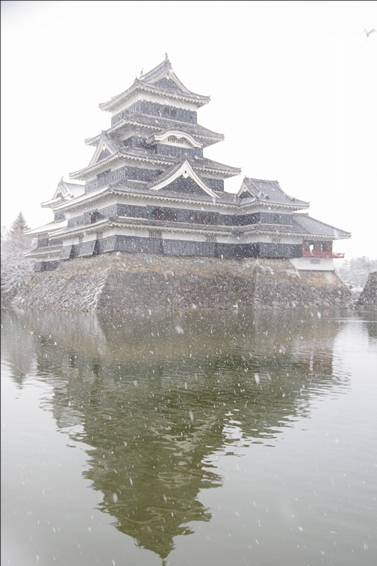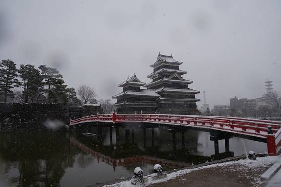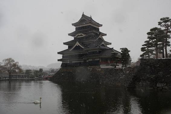 2026年13時15分過ぎに松本城前に着きました。高麗門前から内堀に沿って埋橋まで歩き天守を折からの雪の中で撮影しました。まず、写真1~5は横位置からのものです。