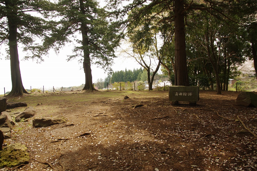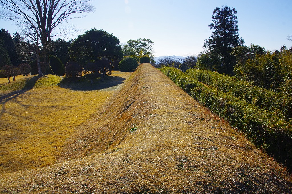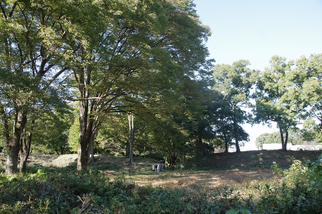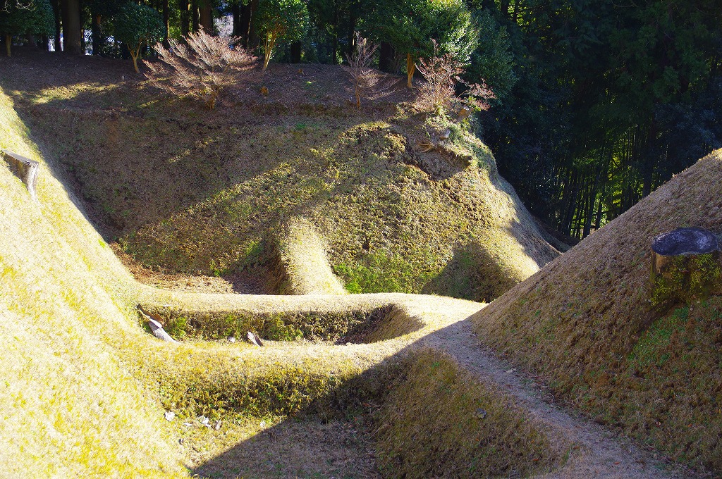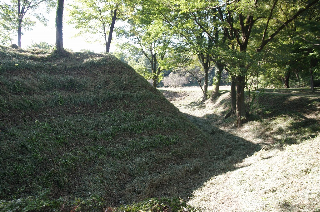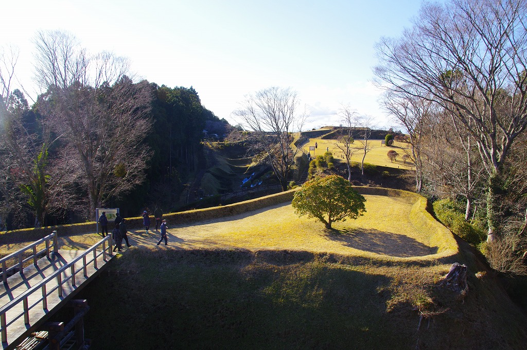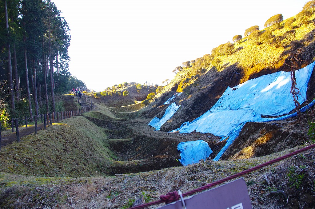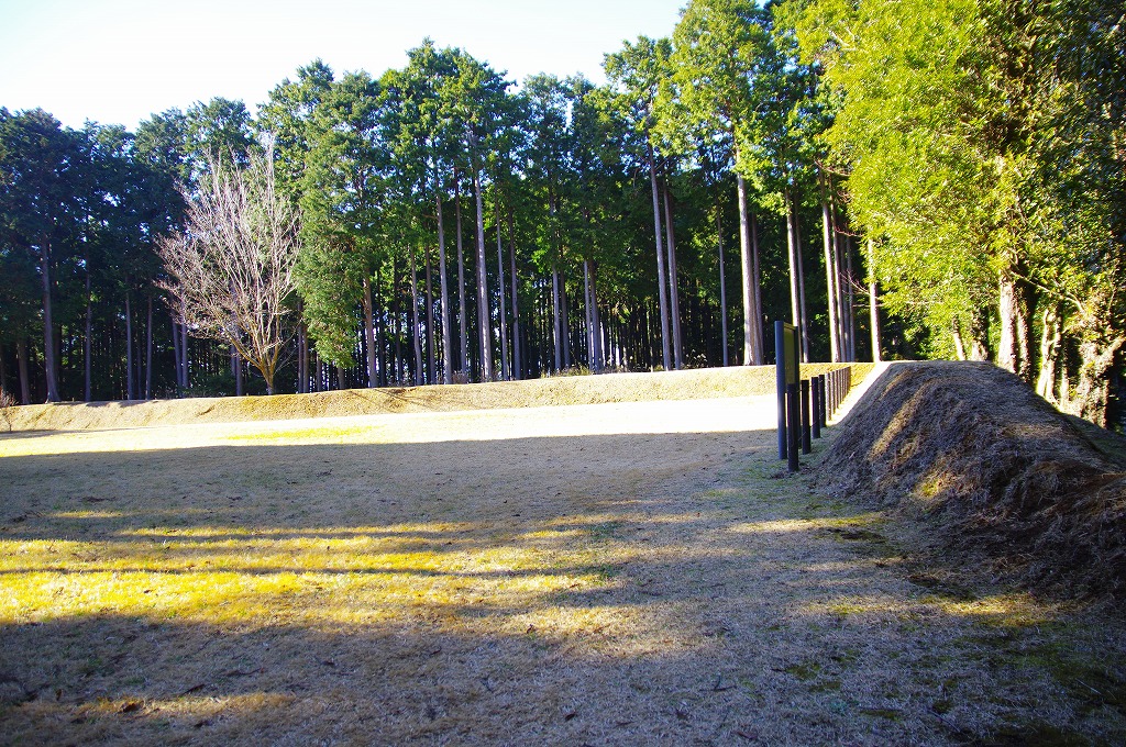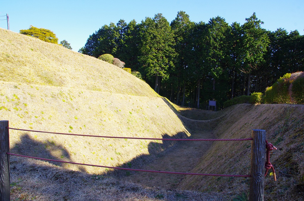時間の関係で本郭、一ノ郭、二ノ郭、西ノ郭、南ノ郭からなる館跡全体を見学することはできず、写真7の、本郭のみです。門土橋前から右へと土塁と空堀を撮りました。