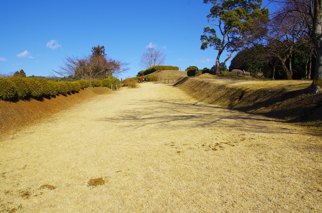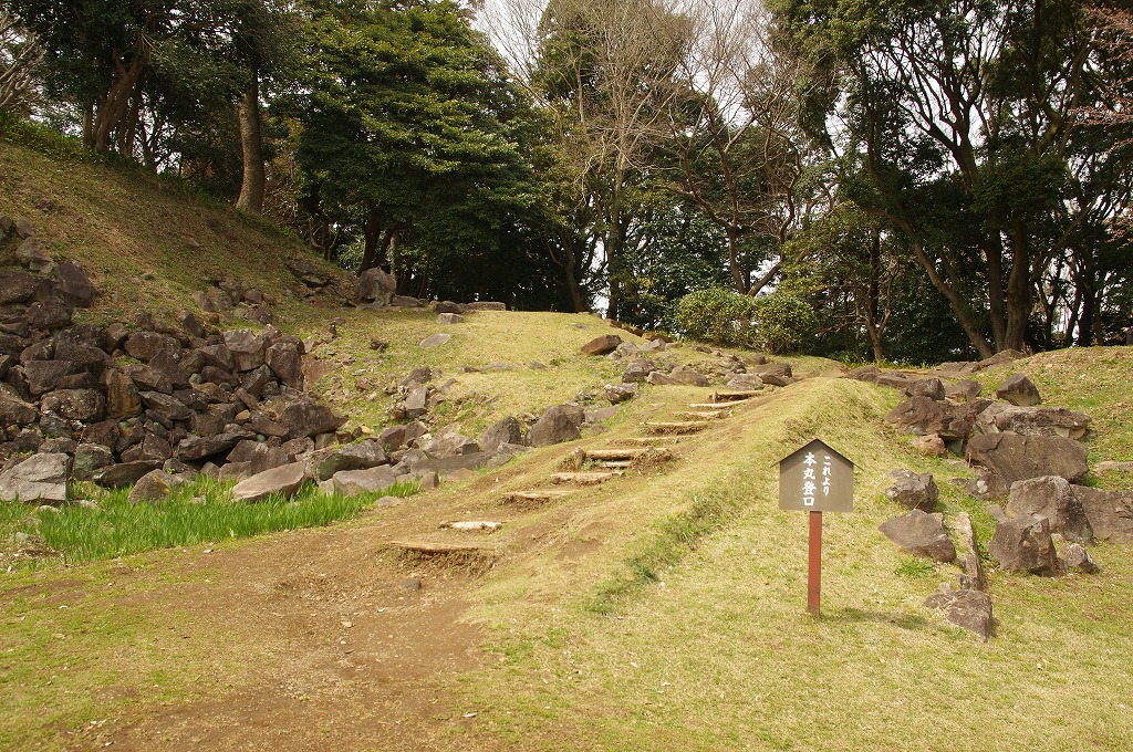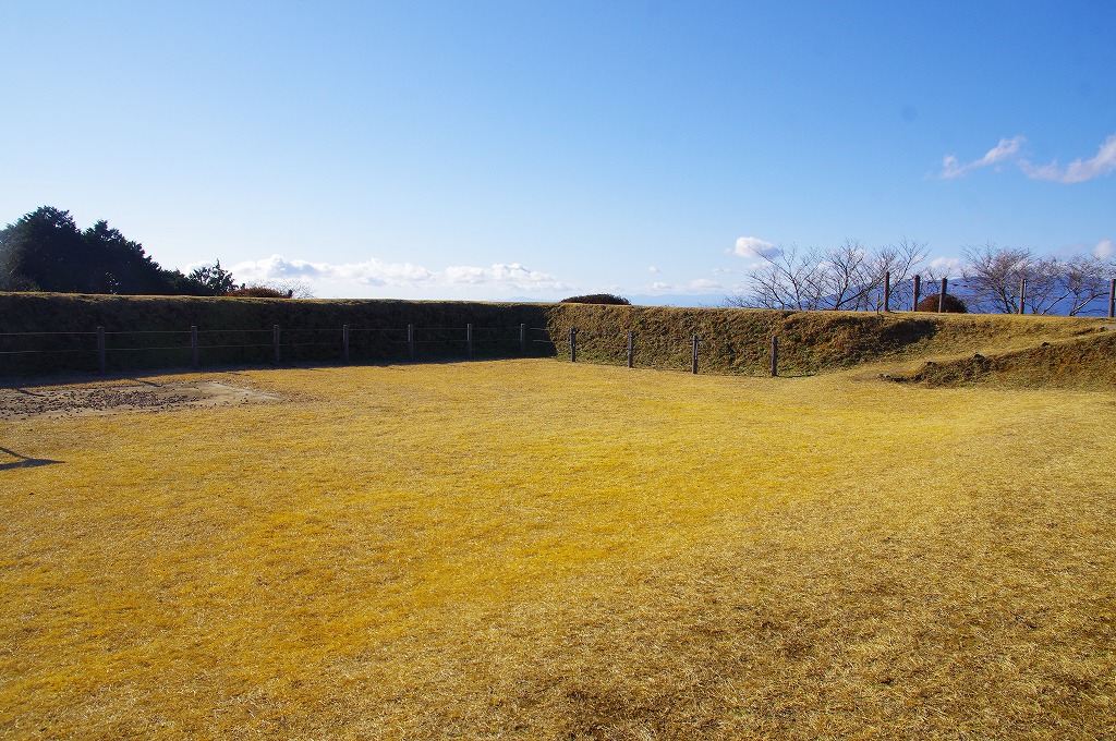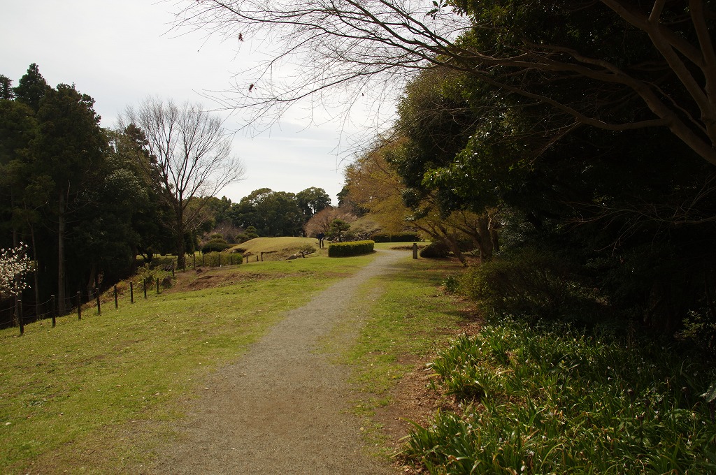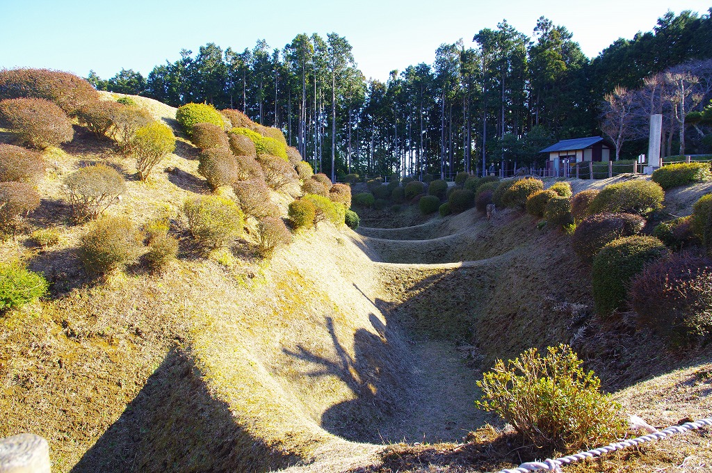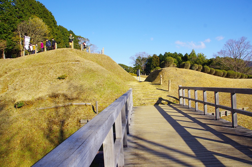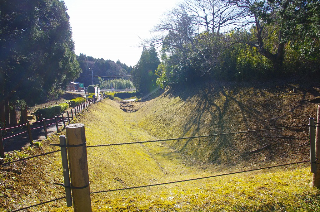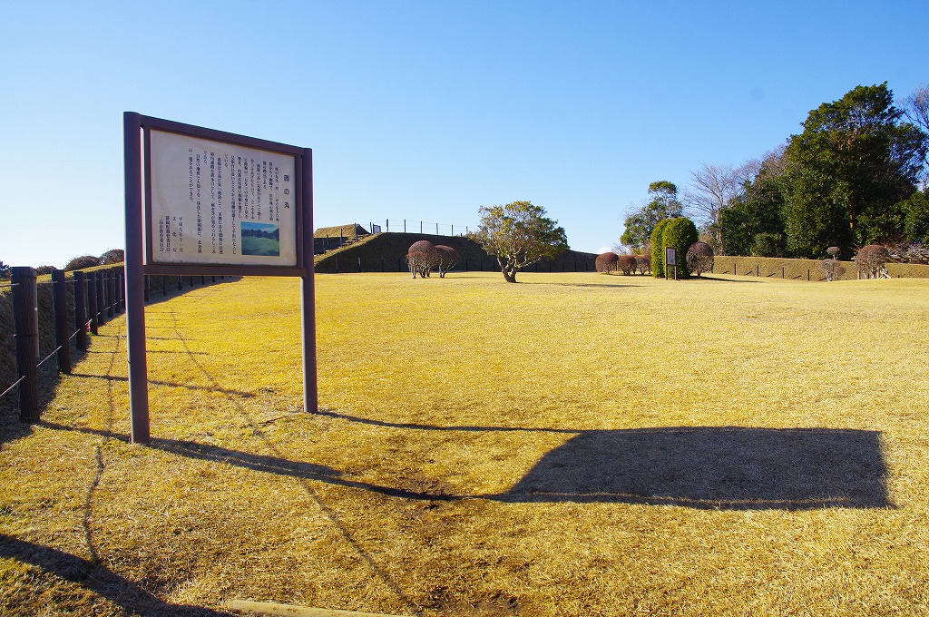 時間の関係で本郭、一ノ郭、二ノ郭、西ノ郭、南ノ郭からなる館跡全体を見学することはできず、写真7の、本郭のみです。門土橋前から右へと土塁と空堀を撮りました。