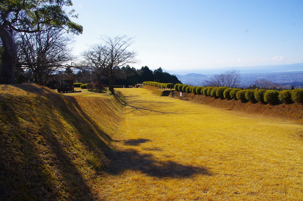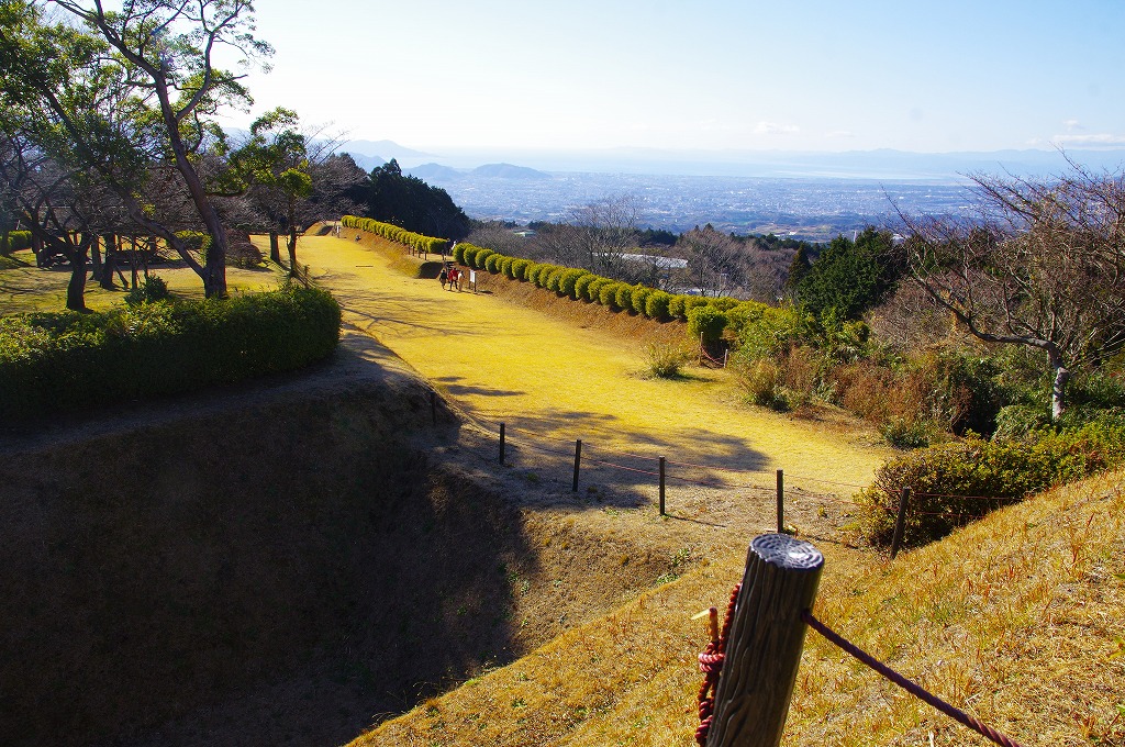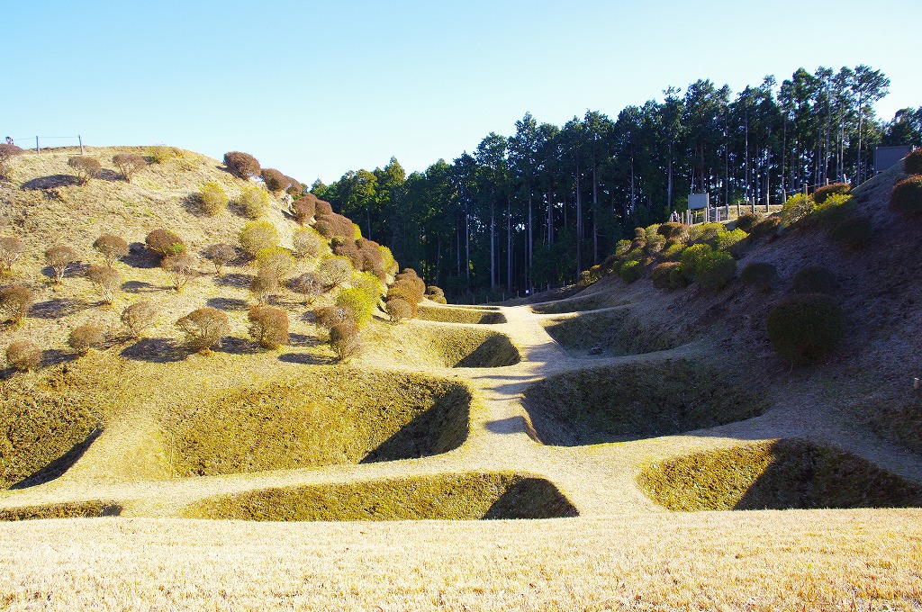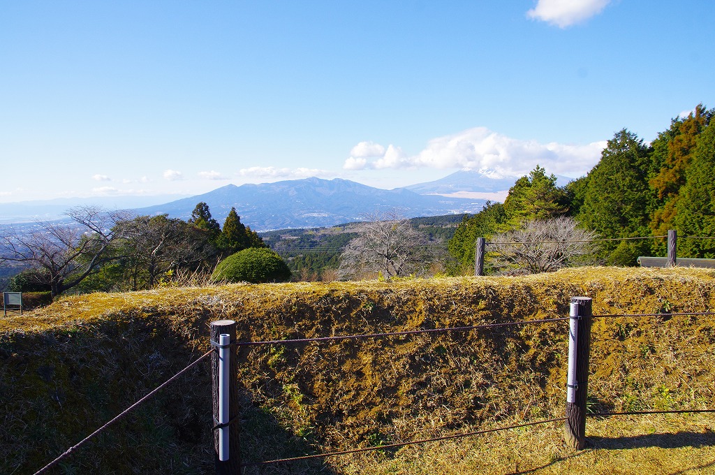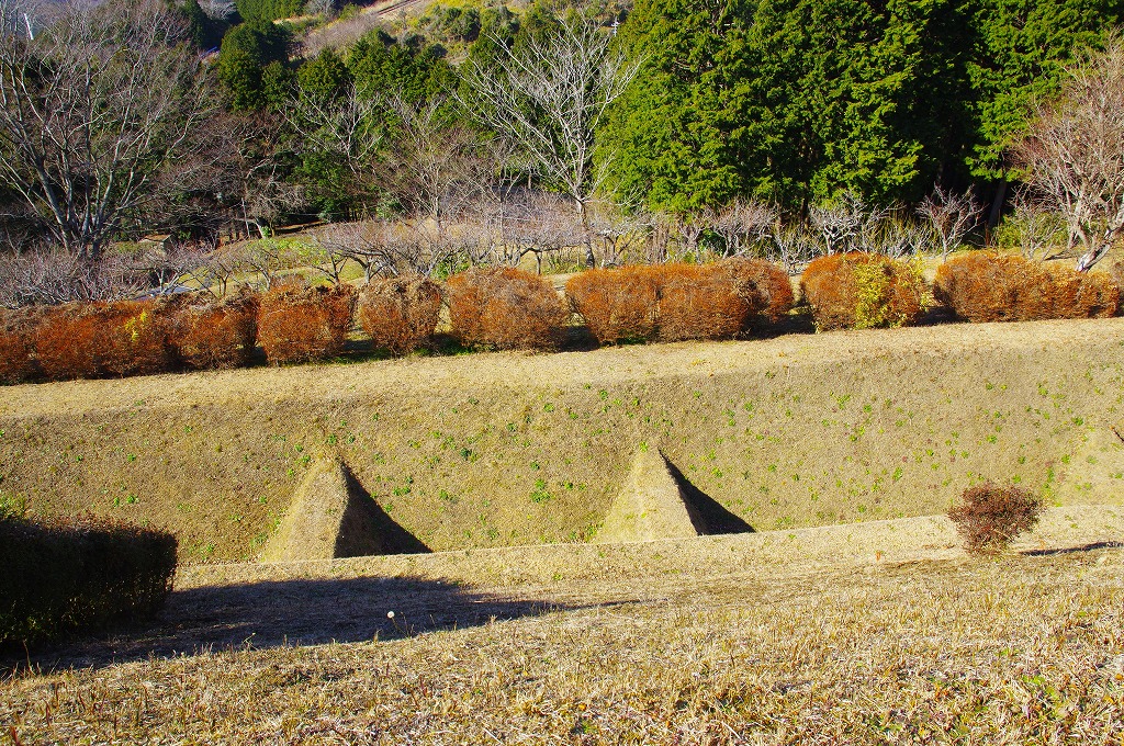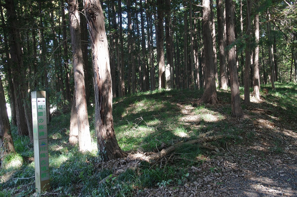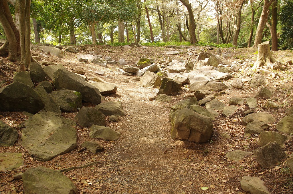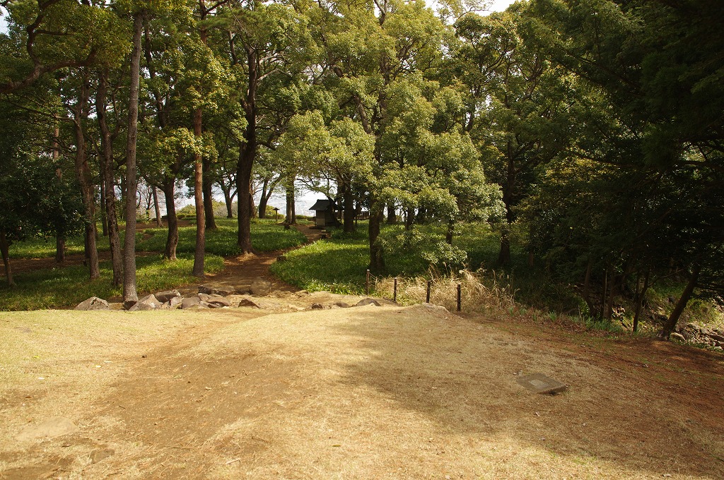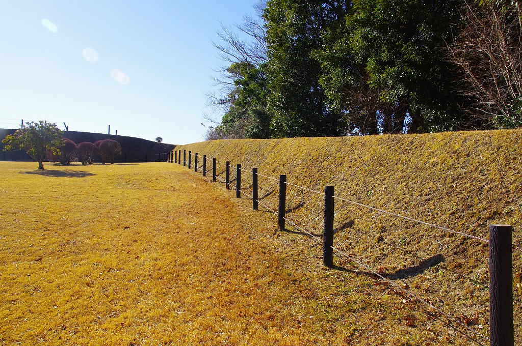 時間の関係で本郭、一ノ郭、二ノ郭、西ノ郭、南ノ郭からなる館跡全体を見学することはできず、写真7の、本郭のみです。門土橋前から右へと土塁と空堀を撮りました。