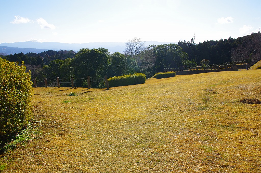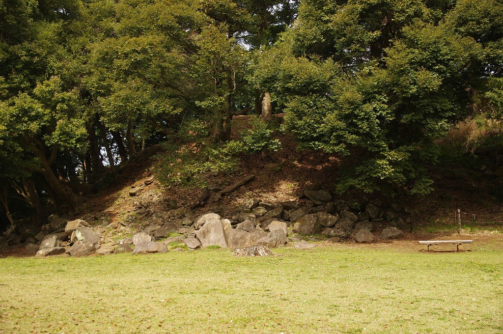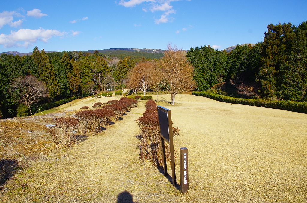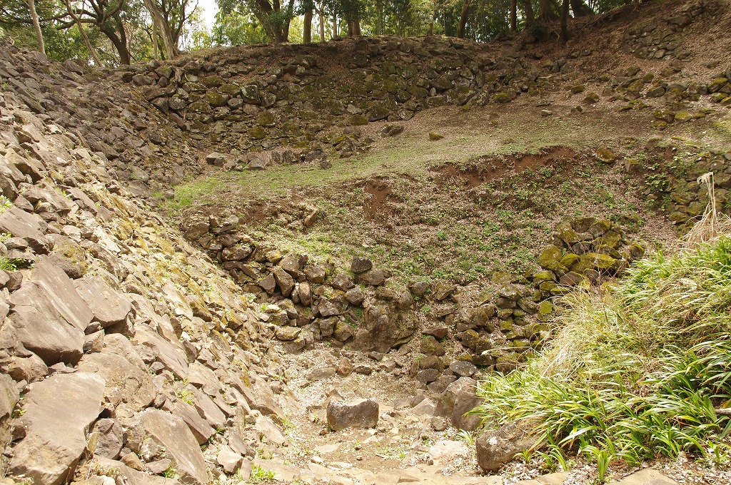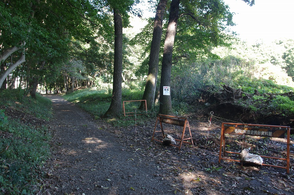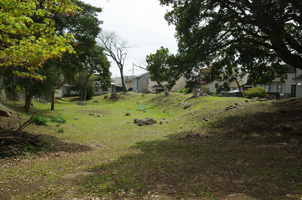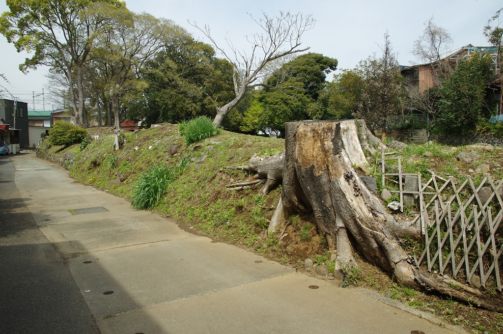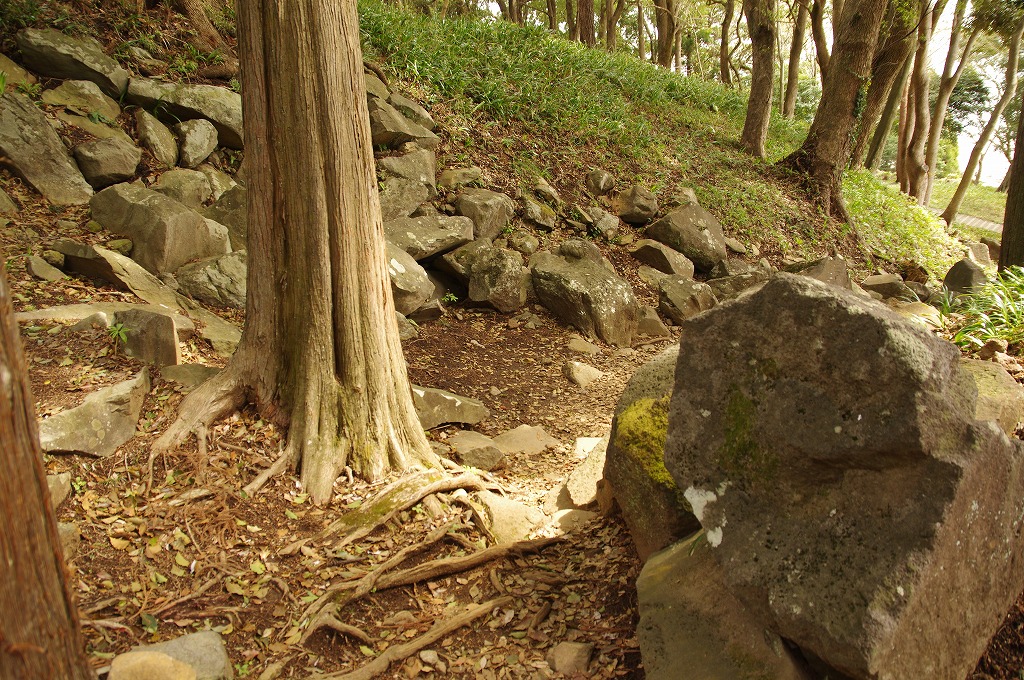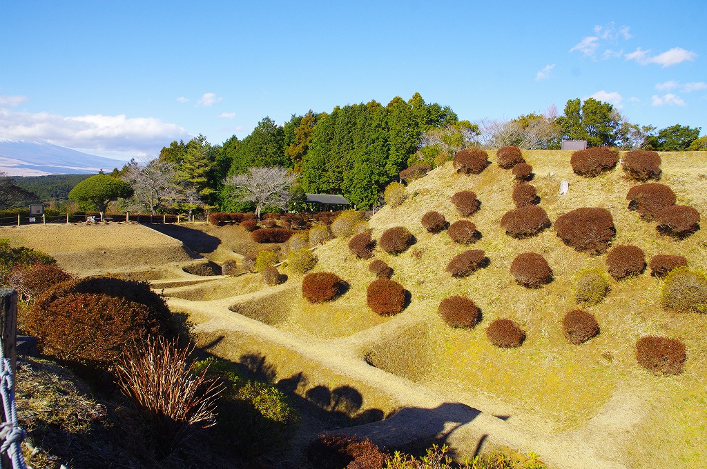 時間の関係で本郭、一ノ郭、二ノ郭、西ノ郭、南ノ郭からなる館跡全体を見学することはできず、写真7の、本郭のみです。門土橋前から右へと土塁と空堀を撮りました。