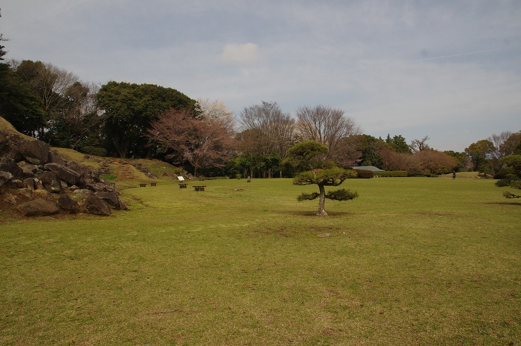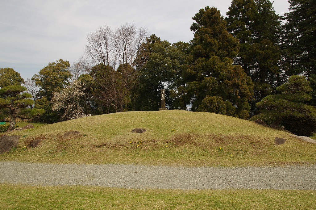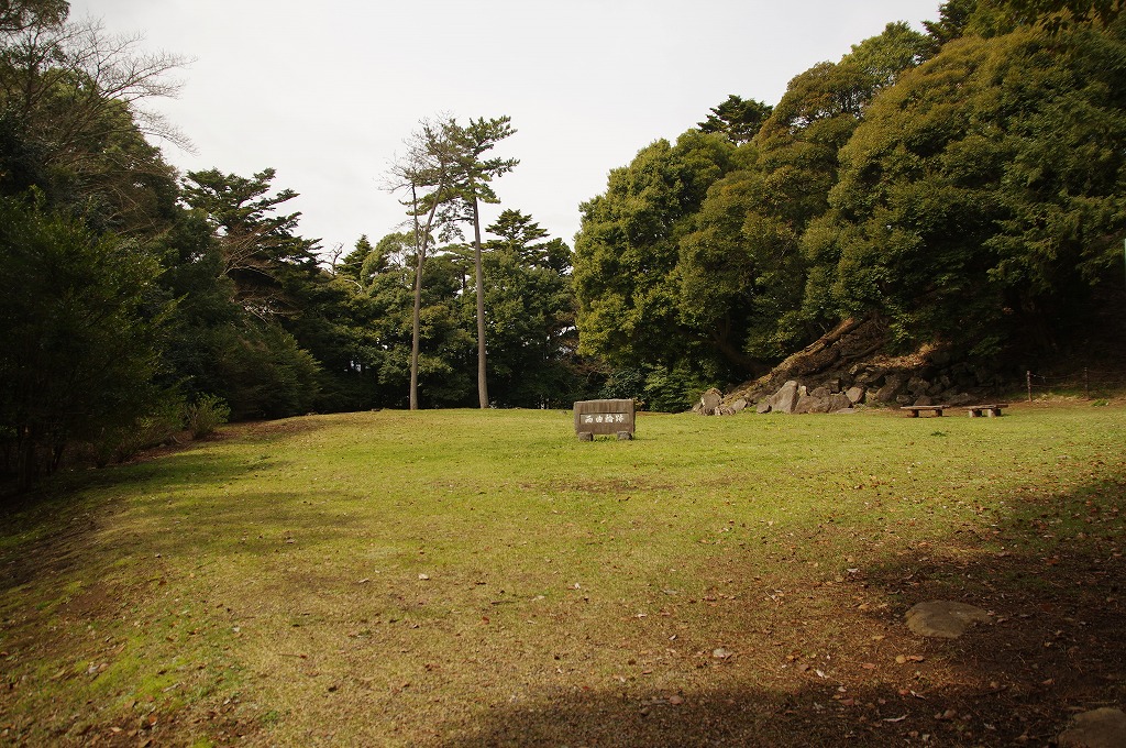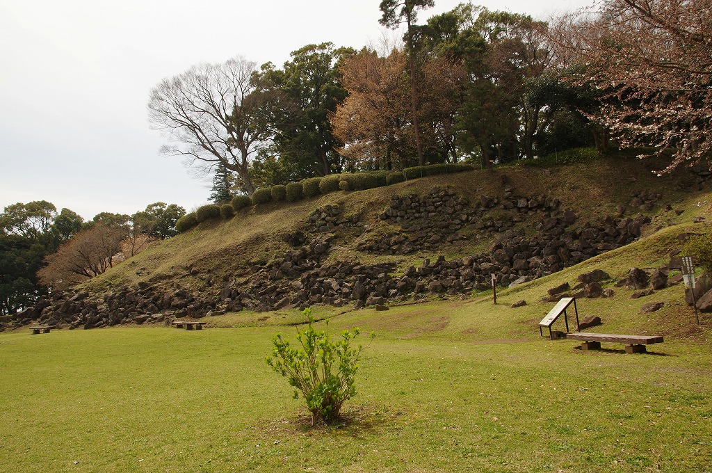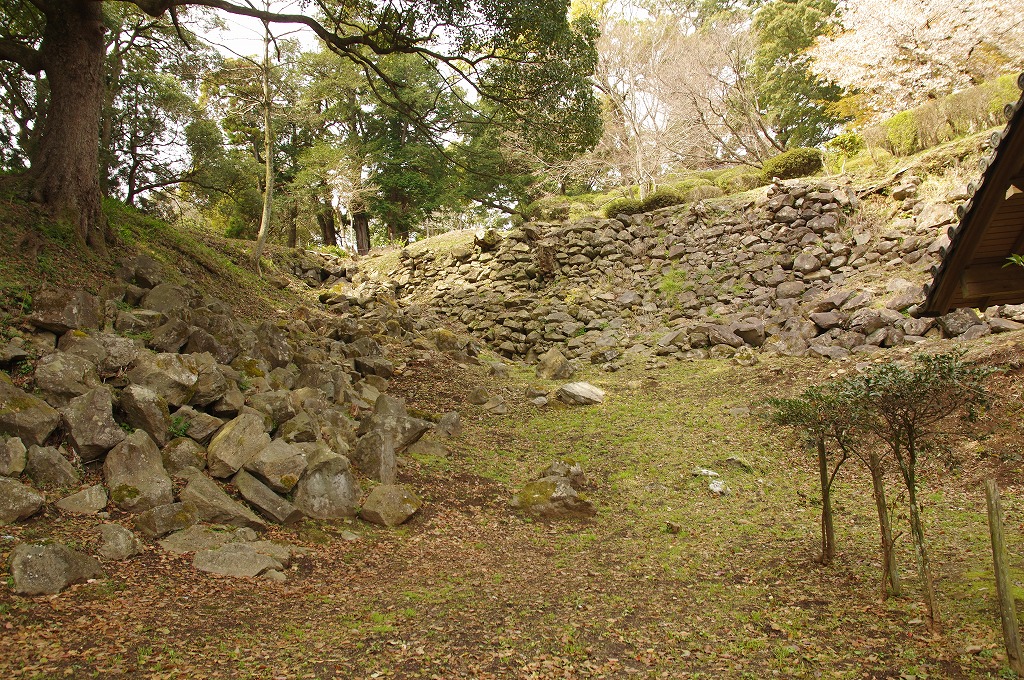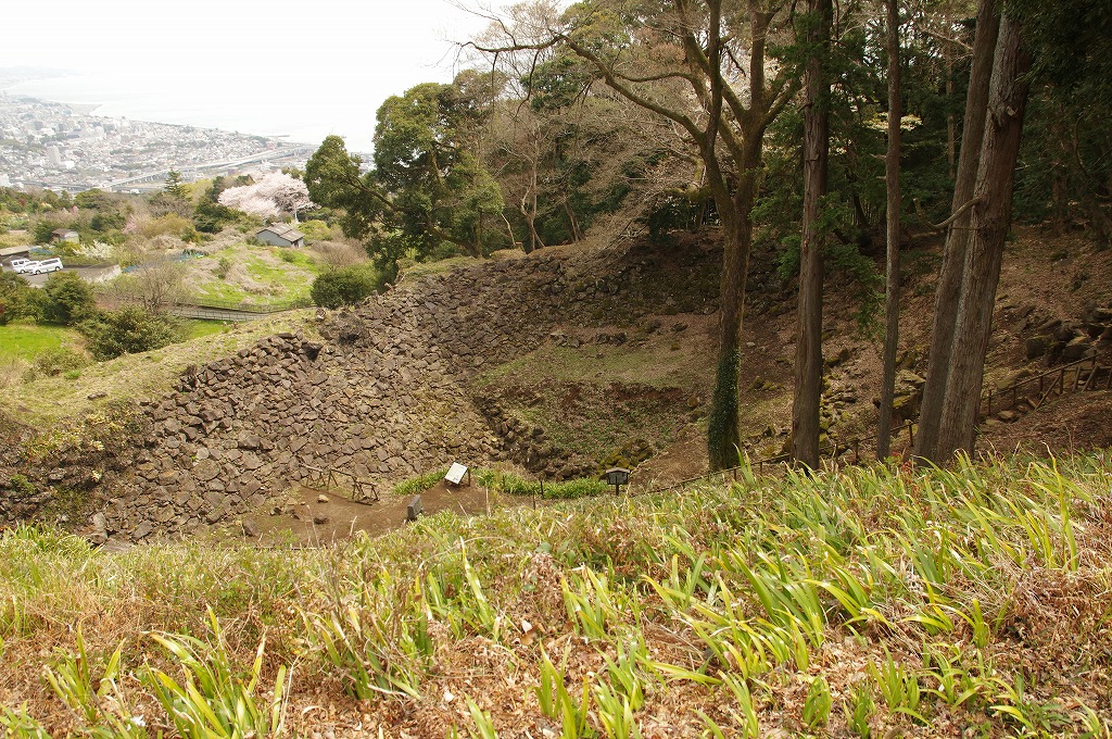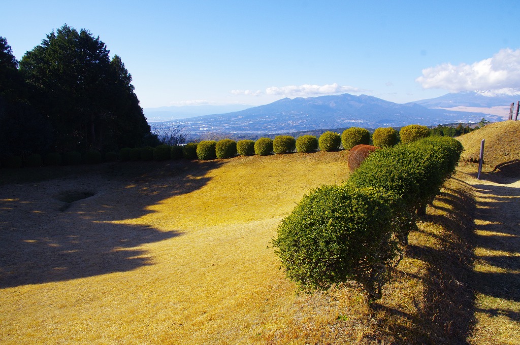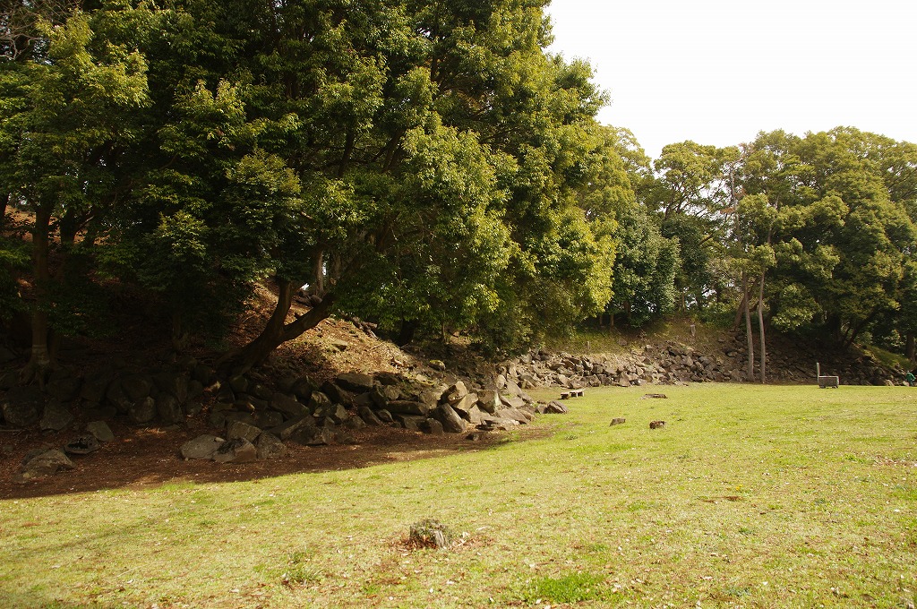 時間の関係で本郭、一ノ郭、二ノ郭、西ノ郭、南ノ郭からなる館跡全体を見学することはできず、写真7の、本郭のみです。門土橋前から右へと土塁と空堀を撮りました。