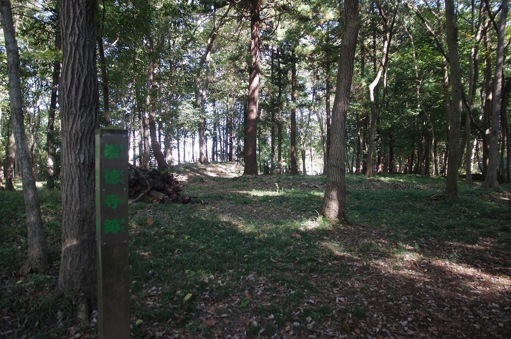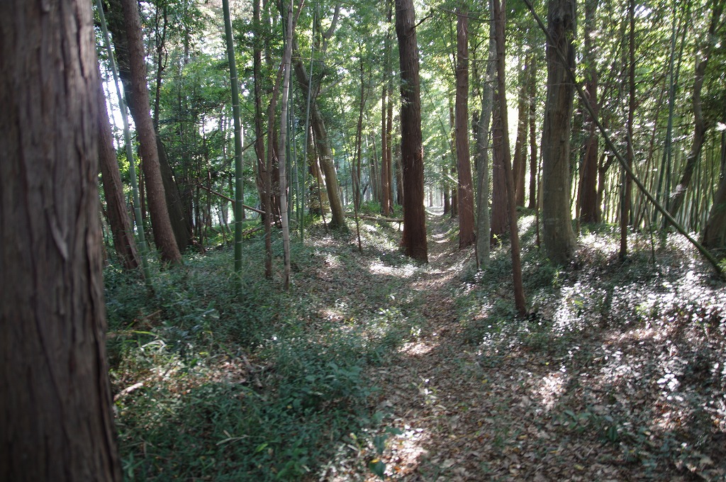 次いで、写真9は、三門館跡(比企郡滑川町和泉1237)です。源頼朝の乳母比企尼の夫比企遠宗の館との伝承のある所です。北西と南東を丘陵で囲まれた地で、発掘調査で北西丘陵上に南北に180mの空堀が認められ、北端から東に50mほど延びています。空堀の両側には土塁が認められます。但し、平地ではなく東西の丘陵地に土塁・空堀を設けた館は例がなく、極めて特異な館跡といえます。西の丘陵上で撮ったものです。。
