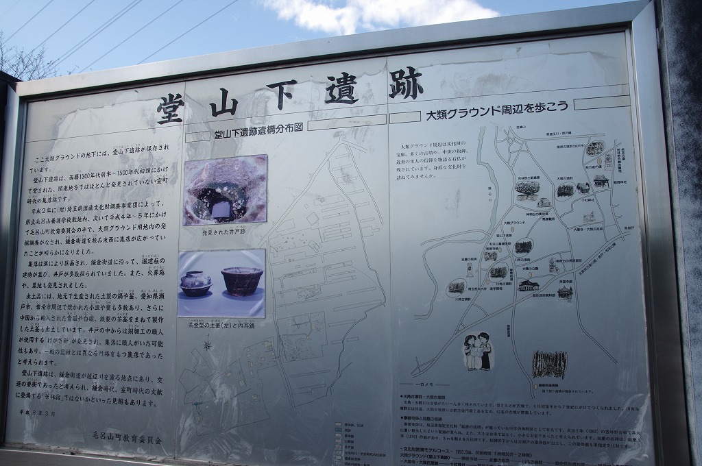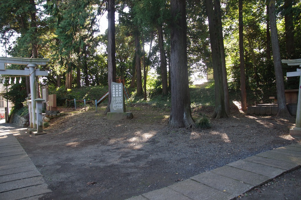 さらに北上して、写真2の、大蔵館跡(比企郡嵐山町大蔵522)に至ります。大蔵神社となっています。源義賢の館跡とされており、現存の遺構から東西170m、南北220m、面積4万㎡の規模を持つ土塁と堀を巡らした方形館です。現存する大館と発掘調査で確認された方70mの小館(北西面)からなっています。発掘調査により12~15世紀にかけて活動していたことが確認されます。場所的には東約100mに鎌倉街道が南北に走り、北に都幾川の河川交通の交わる大蔵宿がありました。ここは、久寿2年(1155)8月、源義朝の長男義平が攻撃し、叔父義賢と養君とした秩父重隆を討取った大蔵合戦の地です。これにより義平は悪源太の威名を轟かします。