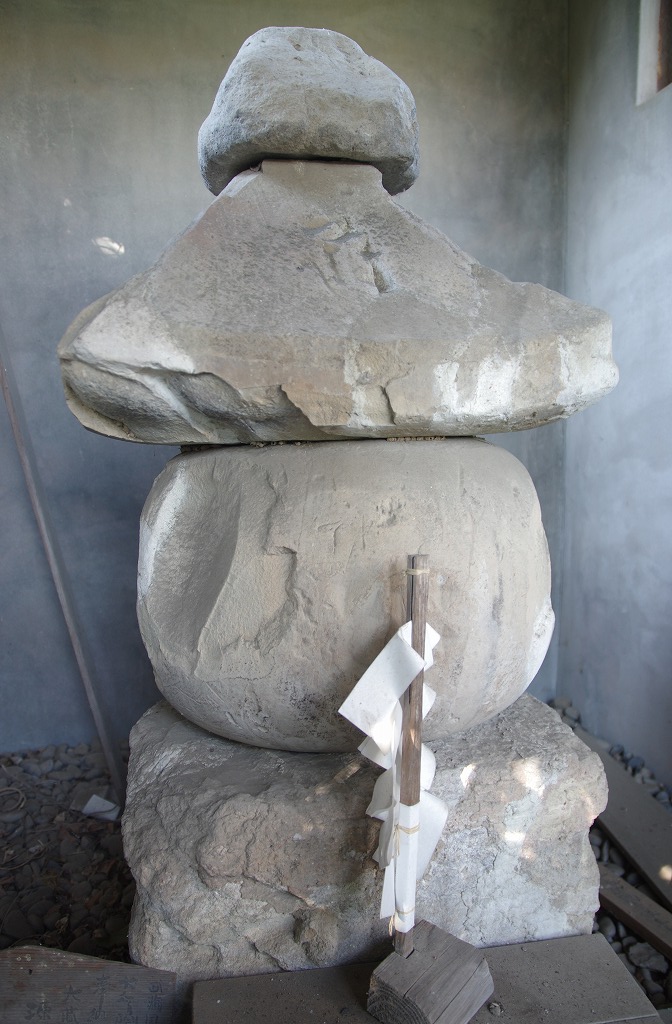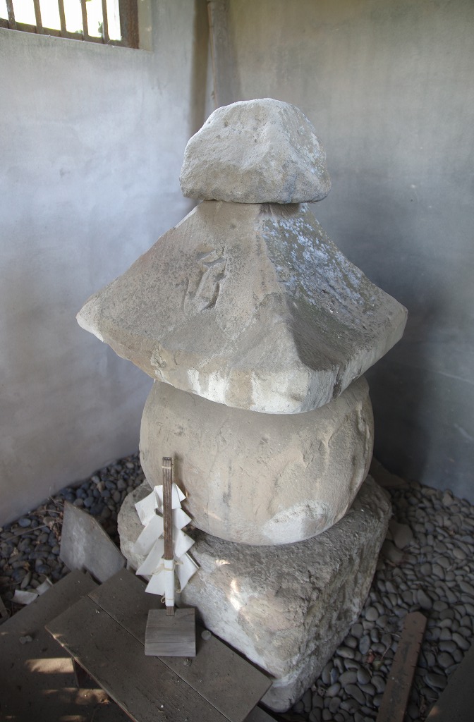 写真4は、大蔵館跡の東に位置する源義賢墓(比企郡嵐山町大蔵66)の五輪塔です。火輪・水輪部のみ現存し、風輪部は欠損し、空輪・地輪部は後から補ったものです。県内最古の部類に属します。コンクリートの覆堂内にあります。左側から撮ったものです。
