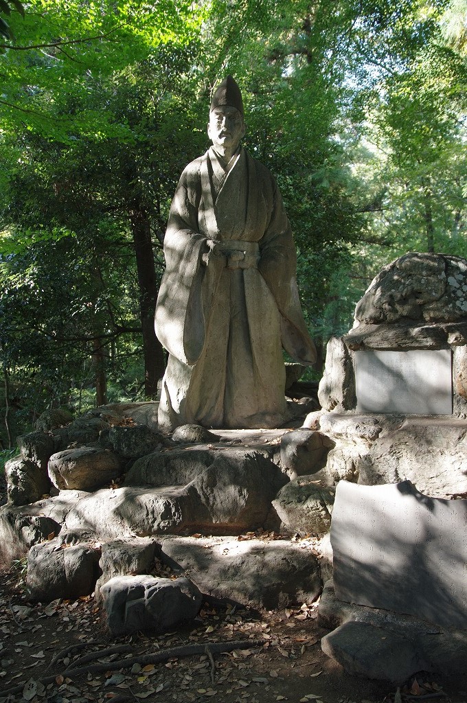 菅谷館跡(比企郡嵐山町菅谷757)へと移動し、写真6は、二郭土塁上にある畠山重忠像です。本館跡は武蔵国最大の武士団である秩父一族の長男流の畠山重忠の居館とされた地です。ただ、発掘調査では鎌倉期の遺構等は確認されておらず、現遺構は戦国時代の城跡といえます。写真6は、畠山重忠像です。